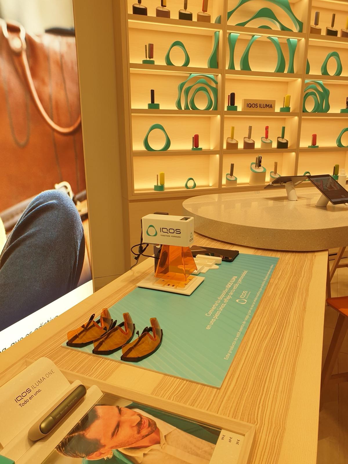 Uno de nuestros proyectos más emblemáticos fue la colaboración con Philip Morris International (IQOS) dentro de la iniciativa global IQOS Together X, en la que desarrollamos y desplegamos la ingeniería de personalización láser de sus dispositivos en puntos de venta de todo el mundo.